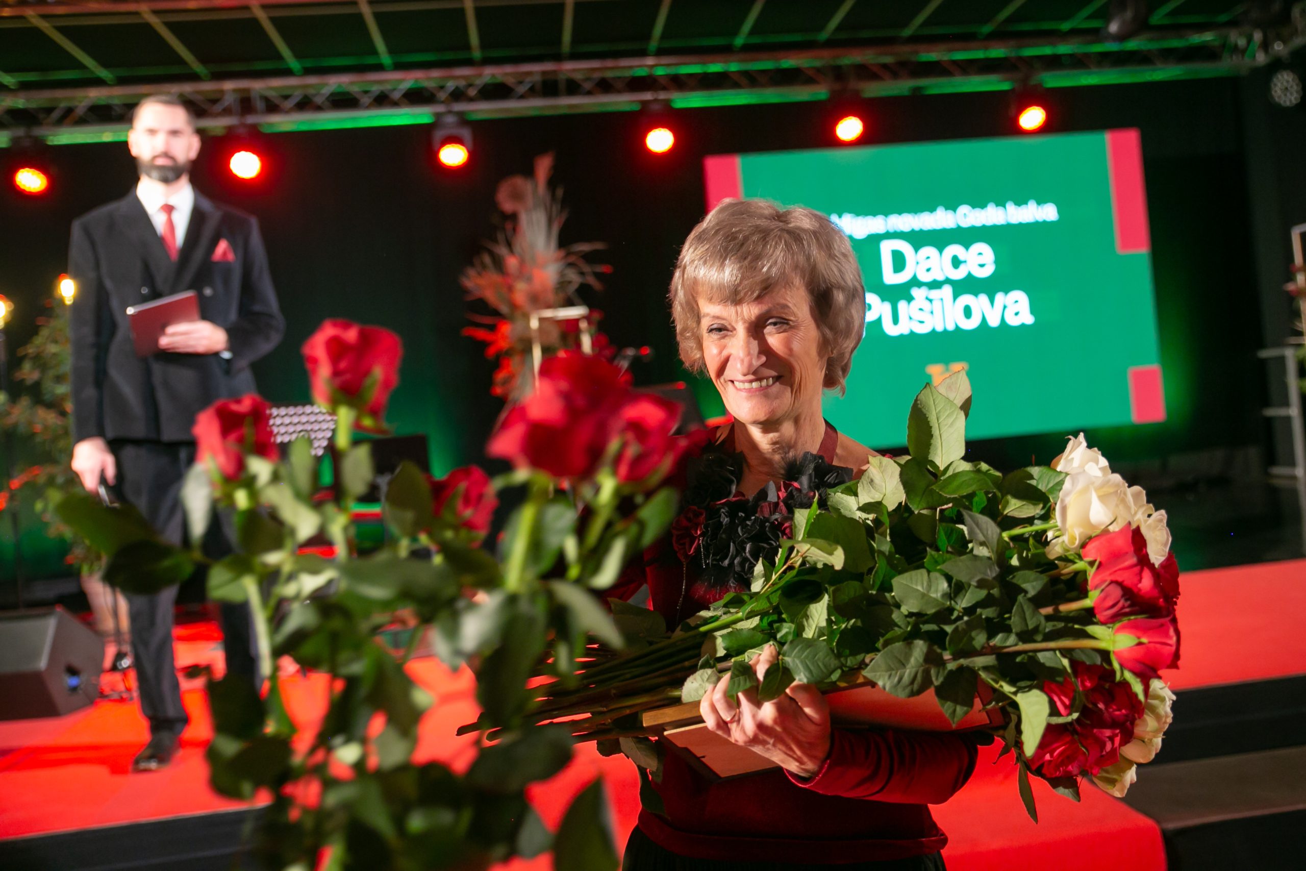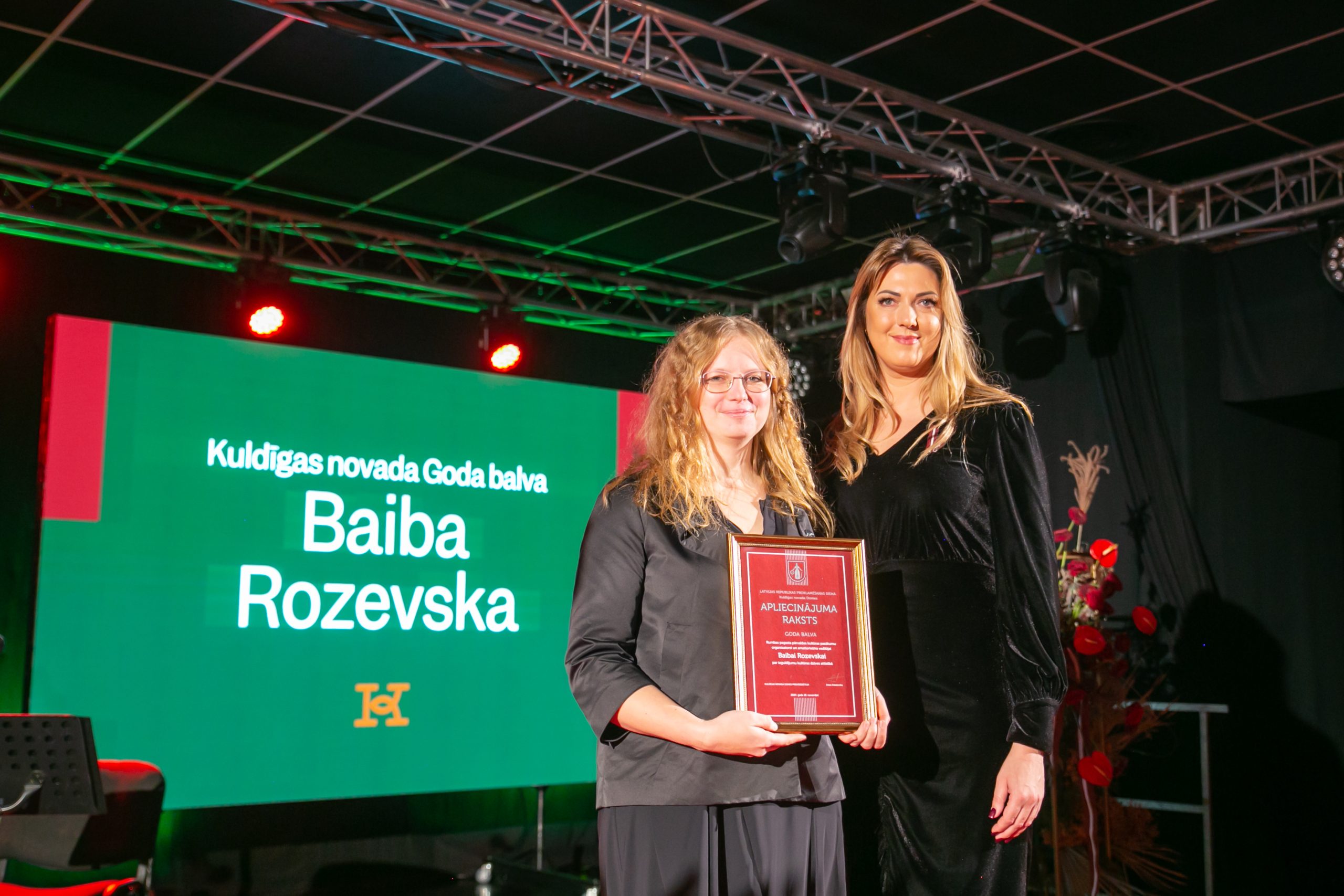 Rumbas pagasta pārvaldes kultūras pasākumu organizatore un amatierteātra vadītāja BAIBA ROZEVSKA Goda balvu saņem par ieguldījumu kultūras dzīves attīstībā. Baiba Rozevska jau desmito gadu vada Rumbas pagasta amatierteātri, kurā darbojas gan pirmsskolas vecuma bērni, gan jaunieši un seniori. Katru gadu Baibas vadībā tiek iestudēts jauns teātra uzvedums, kuriem Baiba pati raksta tekstus, kā arī sarūpē dekorācijas un kostīmus. Viņa prot katram aktierim piemeklēt tieši viņam piemēroto lomu un ar savu sirsnību un labo vadīšanas stilu iedrošina un pamāca jaunos aktierus. Iegūtās zināšanas un tēlotājmākslas spējas amatierteātra dalībniekiem lieliski noder arī ikdienā. Papildus Baiba Rozevska ar savām radošajām idejām priecē Rumbas pagasta iedzīvotājus, kas dzīvo Mežvaldes, Ventas un Novadnieku ciemos. Katru gadu minētās teritorijas tiek izrotātas pašas Baibas darinātās svētku rotās – pārdomāti un gaumīgi. Baibas radošās idejas ir nepārspējamas.