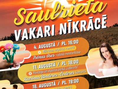 Nīkrāces pagasts Dziedātājas Katrīnas Binderes-Čoderes akustiskais koncerts No 4.–26. augustam Nīkrāces pagastā norisināsies nu jau par tradīciju kļuvušie „Saulrieta vakari”. Vasaras krāšņuma ...