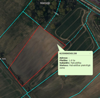 Nomas tiesību izsolē tiek piedāvāts nomas objekts, kas sastāv no zemes vienības ar kadastra apzīmējumu 62500050130, platība 1,60 ha.
